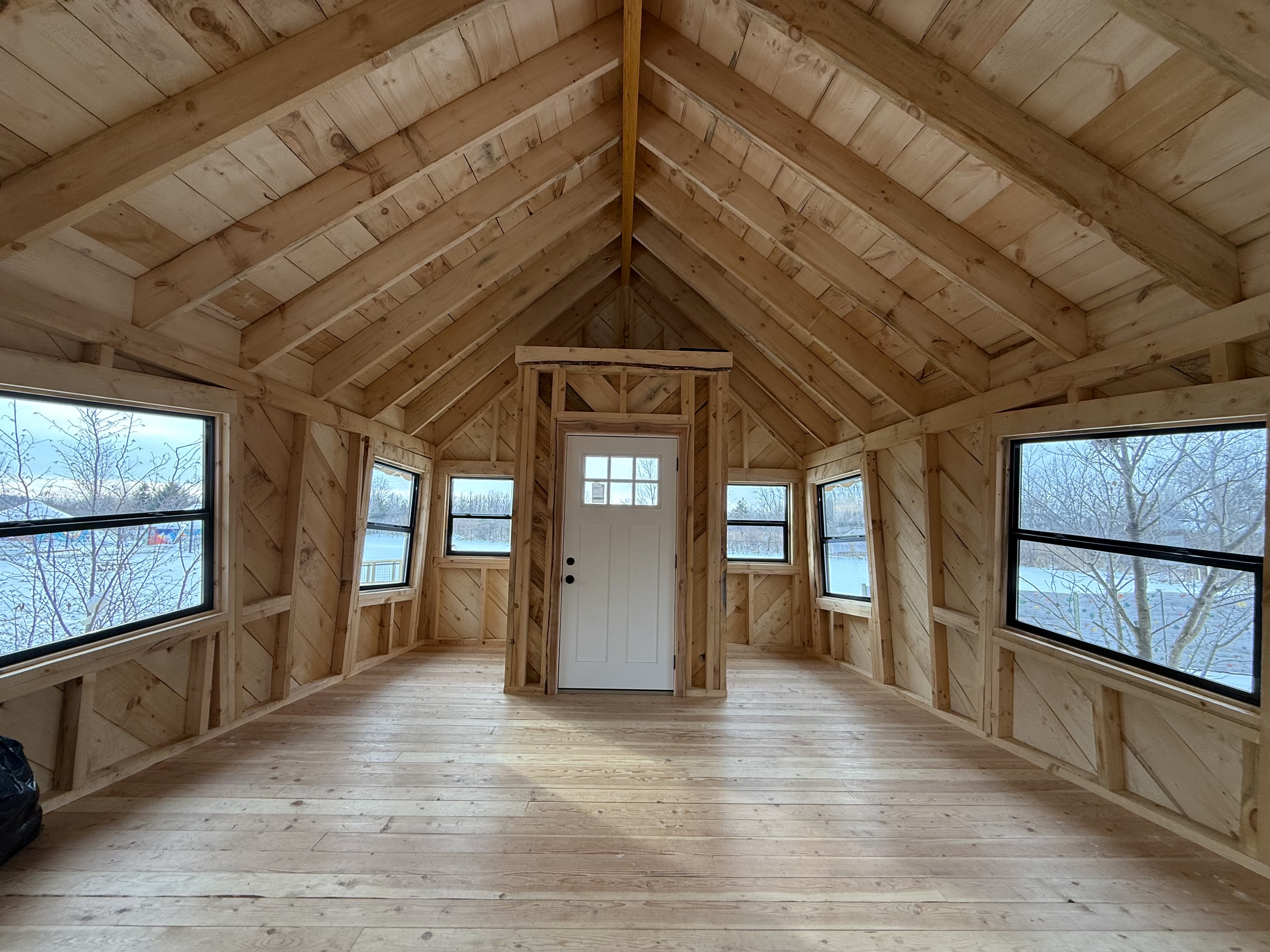 A large clear span decagon roof is a fun challenge in its own right, but when you need 11 posts around the perimeter to make room for a fireplace, you can have some interesting connections at the "Y".  We won't tell all our secrets.